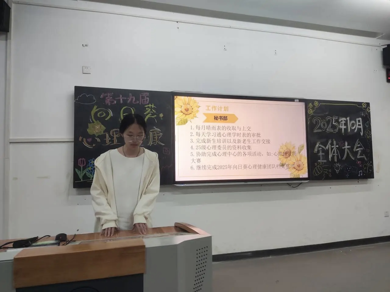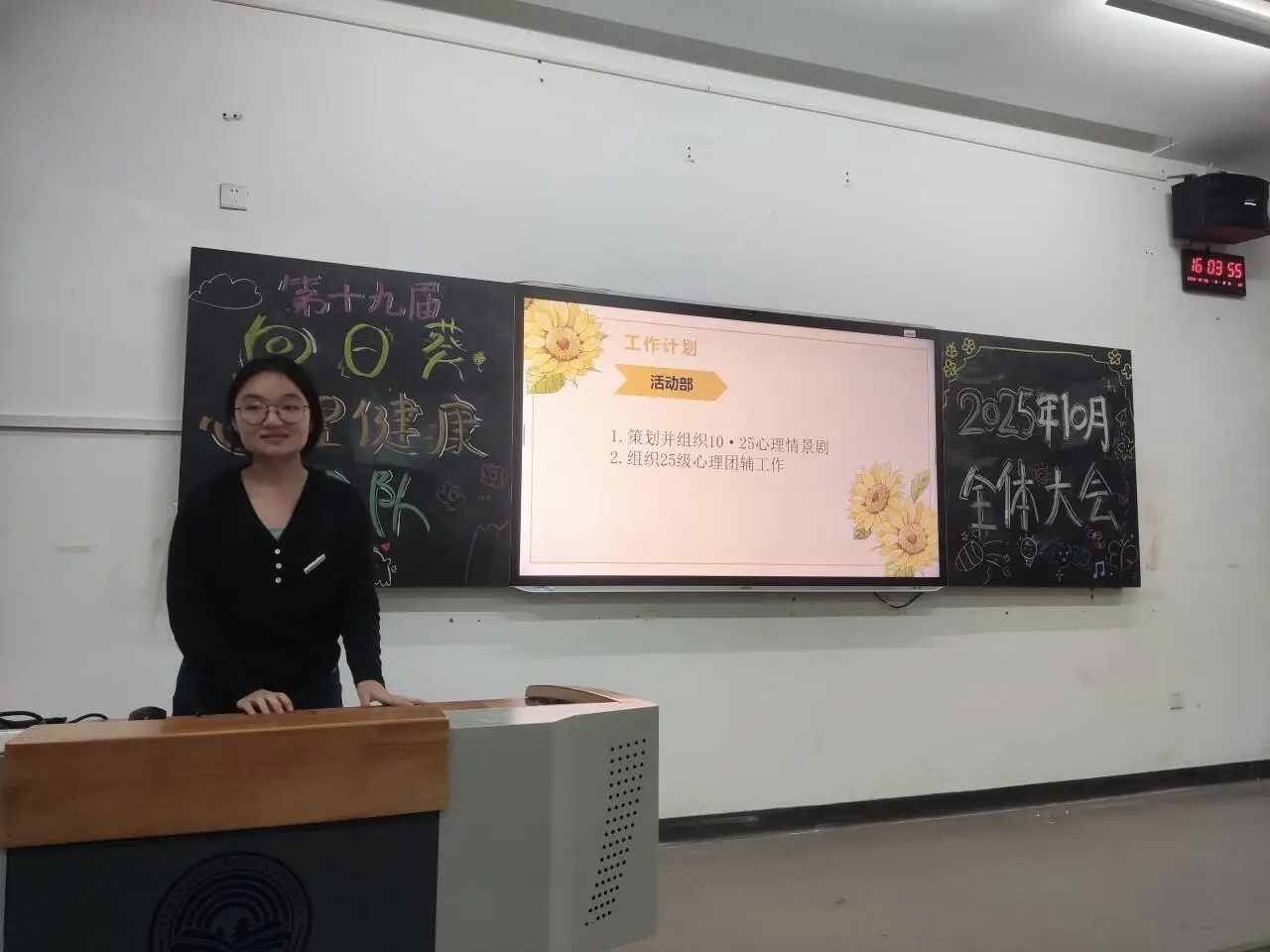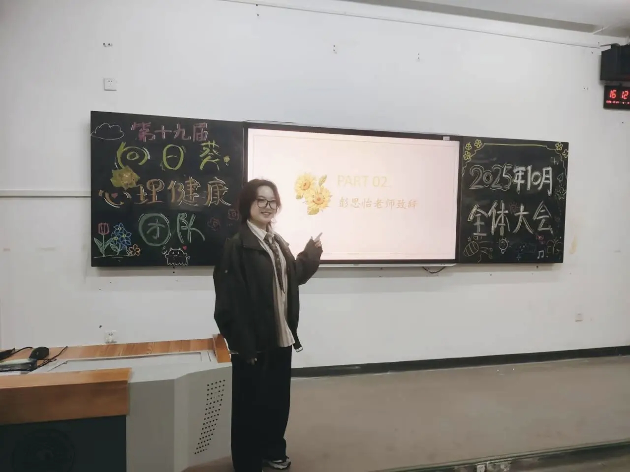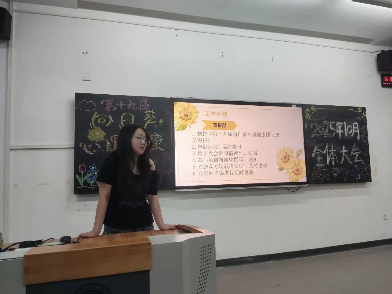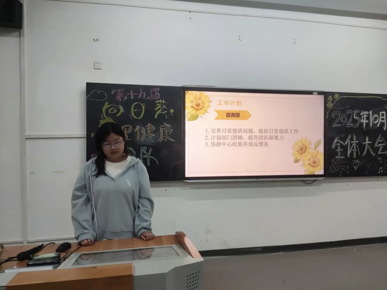 10月29日下午2时,向日葵心理健康团队第十九届第一次全体大会在教1-209顺利召开。会议围绕欢迎新成员、解读工作制度及凝聚团队共识展开,旨在增进成员对团队的归属感与责任感。大学生心理健康教育中心主任杨玖炼老师与指导老师彭思怡应邀参加,会长黄琪主持本次会议。