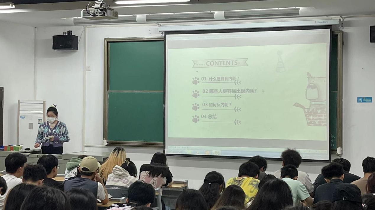 第三,“如何反内耗”这是胡汇庭老师强调的重点,她给出了以下几种办法:1 合理表达情绪,当我们压力较大时,要学会合理地去表达自己的情绪。精神内耗的同学比较温柔、很不善于倾诉。因此,有些负面情绪要表达出来,要及时寻找合适的宣泄口,这样可以使精神内耗严重的情况得到改善。2 培养兴趣爱好,当我们要做许多事情,不愿意做却又没有办法时,我们可以培养一些兴趣爱好或者转移自己的注意力,先去听一会音乐做一些自己喜欢的事情,再专心致志投入到所要做的事情中,这样会使让我们的精神逐渐规律。3 适量运动当你们觉得心里压抑却又无人倾诉时,那就去运动吧!可以去操场上跑跑步,也可以在宿舍练练瑜伽,适量的运动可以促进我们体内的新陈代谢。有助于我们拥有一个好心情。