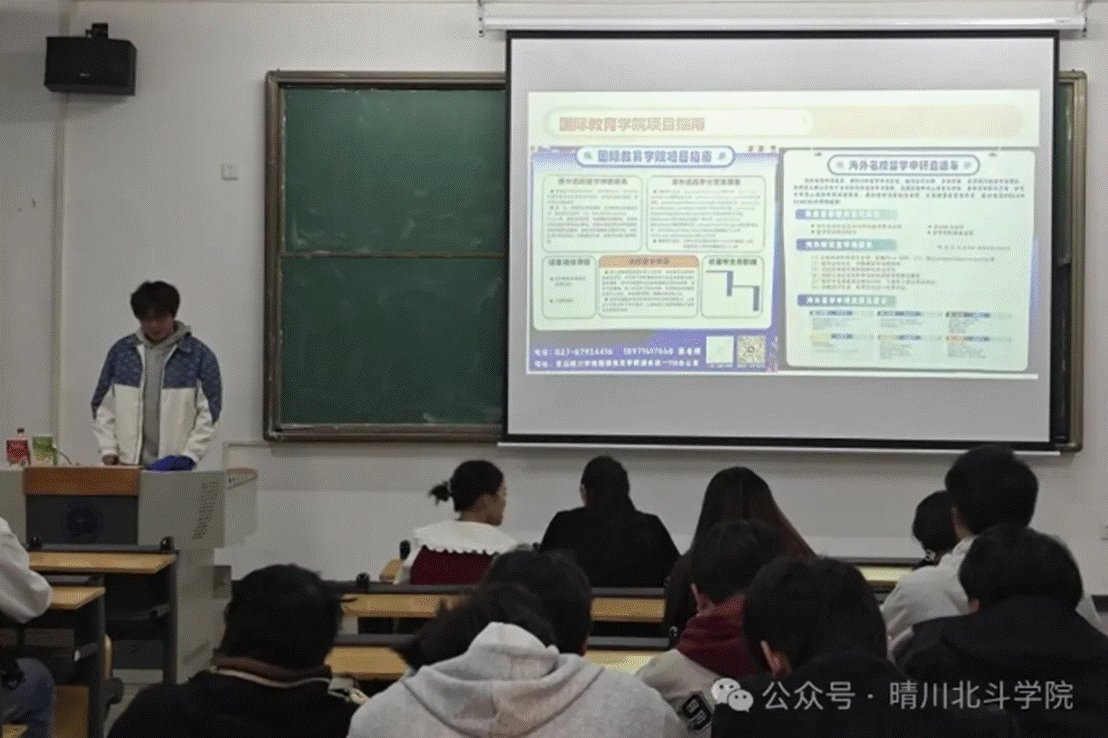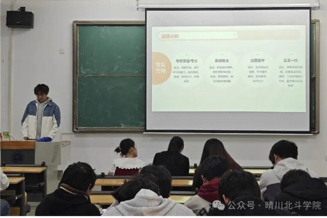 大三是校园与社会的“衔接关卡”,每一个选择都关乎未来走向。主持人将“考研考公、直接就业、出国留学、三支一扶”四大主流发展方向设计为“路线卡片”,并明确“适合自己的才是最优解”的核心观点。针对有出国意向的同学,主持人还详细解说了国际教育学院的“留学支线支持”,涵盖学分交流、语言培训、申研指导等实用内容,引发同学们纷纷记录。