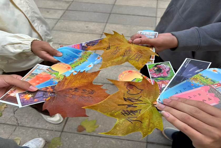 在分享互动环节,同学们按照活动要求,将合影配文“一叶一愿,设计未来,把心愿落在秋天里,用创意写下未来的方向”分享至朋友圈,在社交互动中收获亲友的祝福与鼓励。截止活动结束,现场氛围温馨有序,同学们在创作与交流中,既体验了自然艺术的独特魅力,也实现了内心情绪的温和释放,切实感受到校园生活的温暖与治愈。