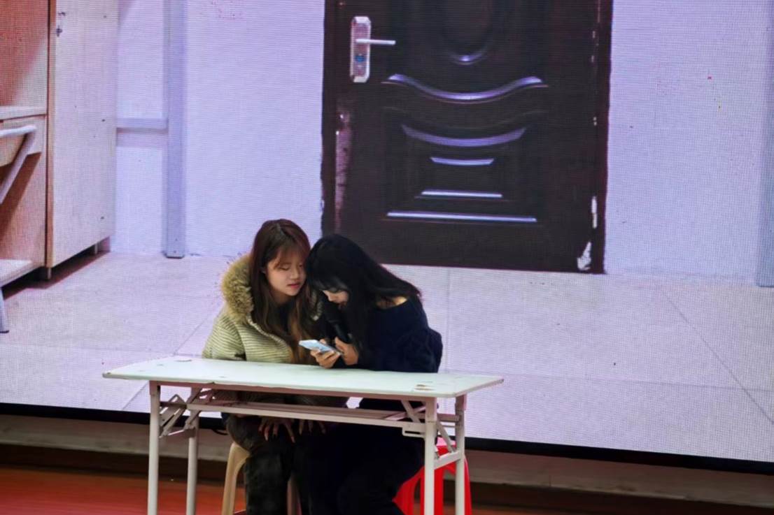 数媒2502班的《破屏见春》该剧演员们通过精准演绎三位陷入不同虚拟困境的大学生,将角色的挣扎与成长娓娓道来。林晓的扮演者通过精心设计的肢体语言,展现了对社交媒体认同的渴望与焦虑;张宇的饰演者用极具张力的表演,呈现了被网络暴力笼罩的无助与愤怒;而李浩的演员则通过细腻的情绪转变,刻画了在游戏世界里寻找成就感的迷茫与空虚。在转折段落中,赵阳、王磊、陈悦等演员通过真挚动人的对白和温暖的互动,展现了同龄人之间的理解与支撑,共同完成了一场从"困于屏"到"破屏而出"的温暖救赎。