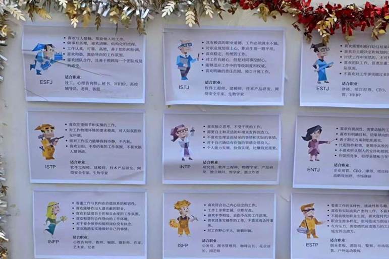 活动现场氛围感拉满!精心布置的MBTI主题板报前,同学们络绎不绝。板报以清新配色分区呈现十六型人格,不仅详细标注了每种人格的核心特质、思维模式、行为偏好,更针对性列出了适配的职业方向与发展建议,从“ENTP的创新型职业清单”到“ISFJ的关怀型岗位推荐”,让大家能对照自身经历逐条比对,慢慢解锁属于自己的性格密码。不少同学一边看一边和身边朋友交流:“原来我喜欢规划、注重细节,是典型的ISTJ!”“这份职业建议和我想尝试的方向不谋而合。”