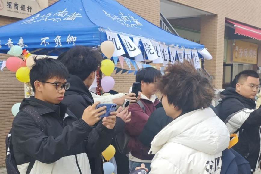 打卡合影区更是热闹非凡!同学们手持自己的人格标识卡片、写满心声的便签纸,或是和好友并肩站在板报前,或是独自定格瞬间,脸上都洋溢着灿烂的笑容。有的摆出搞怪姿势,有的认真比耶,镜头下的每一张笑脸,都藏着对自我的新认知与对未来的憧憬。不少同学还主动分享合影,配文“解锁人格标签,收获满满干货”,让这份快乐在朋友圈持续传递。