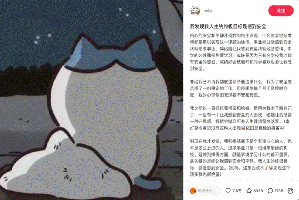 同时,「安全感」这个词本身,也在使用中逐渐变得模糊和泛化。如今,许多行为都被简单地归因于「缺乏安全感」——因为没有安全感,我们不敢辞职,不愿社交、不敢恋爱。
